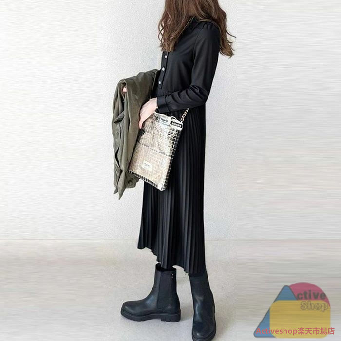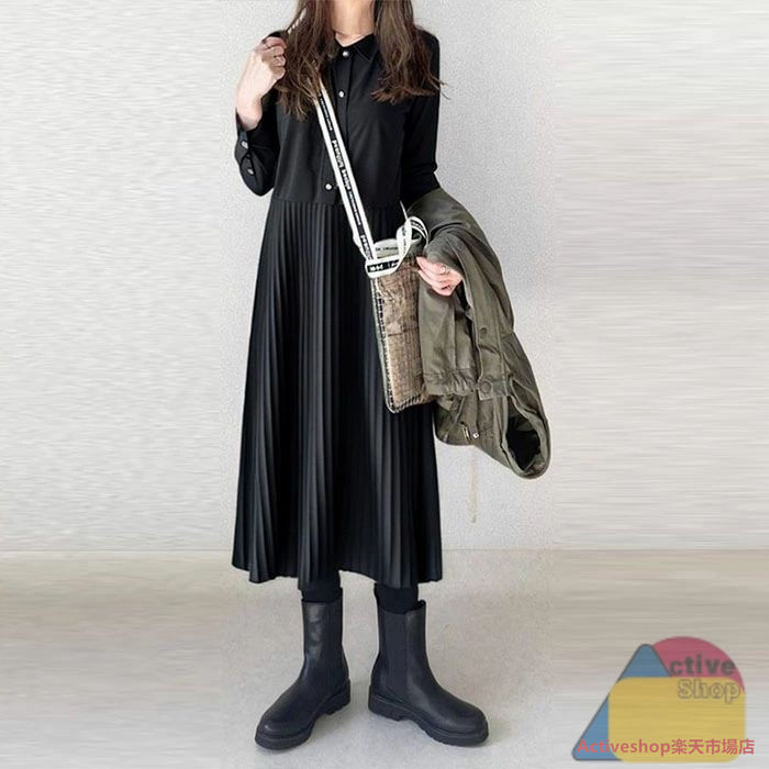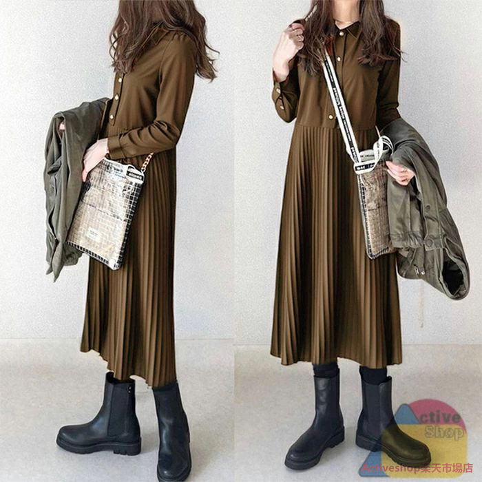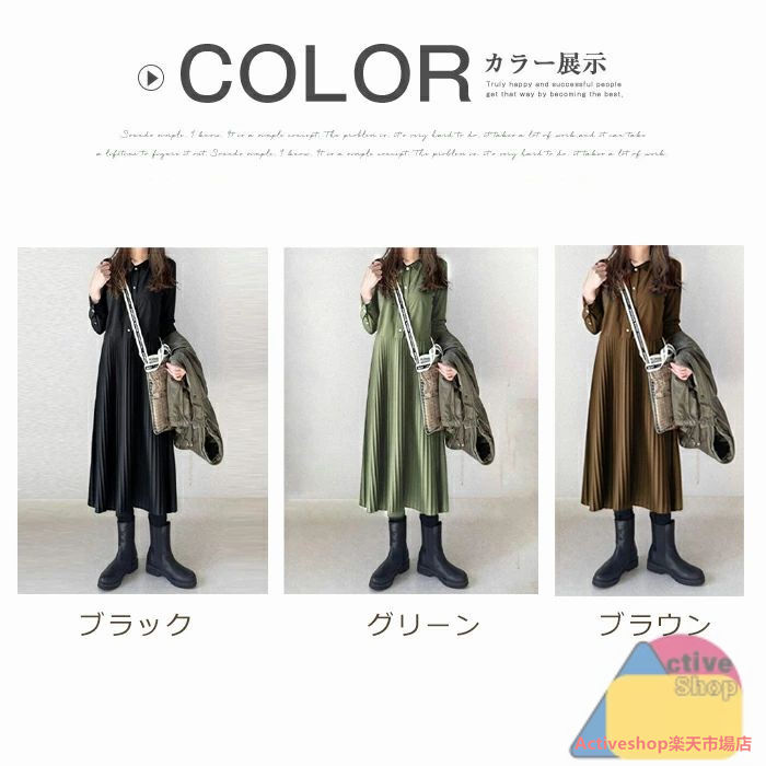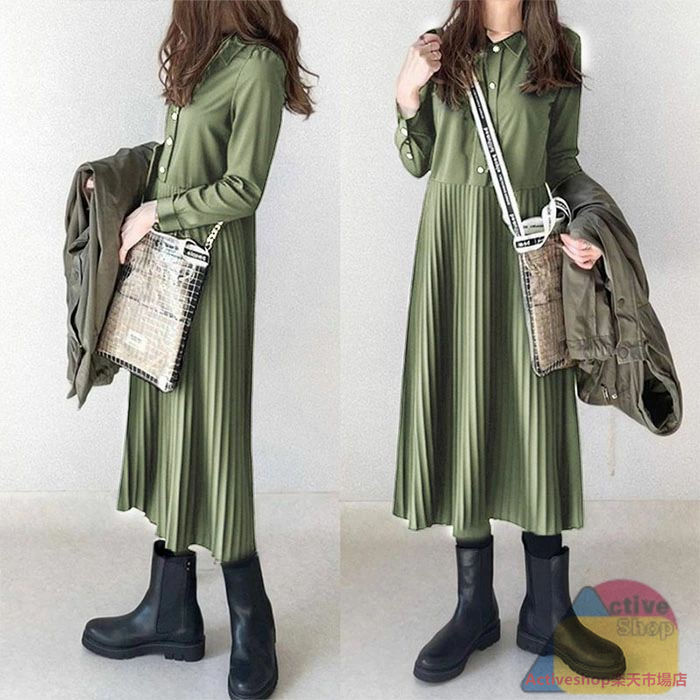 シャツワンピース 秋 冬長袖 ロング ブラック グリーン ブラウン S M L