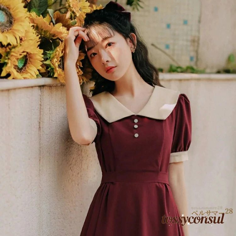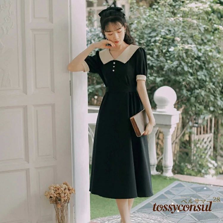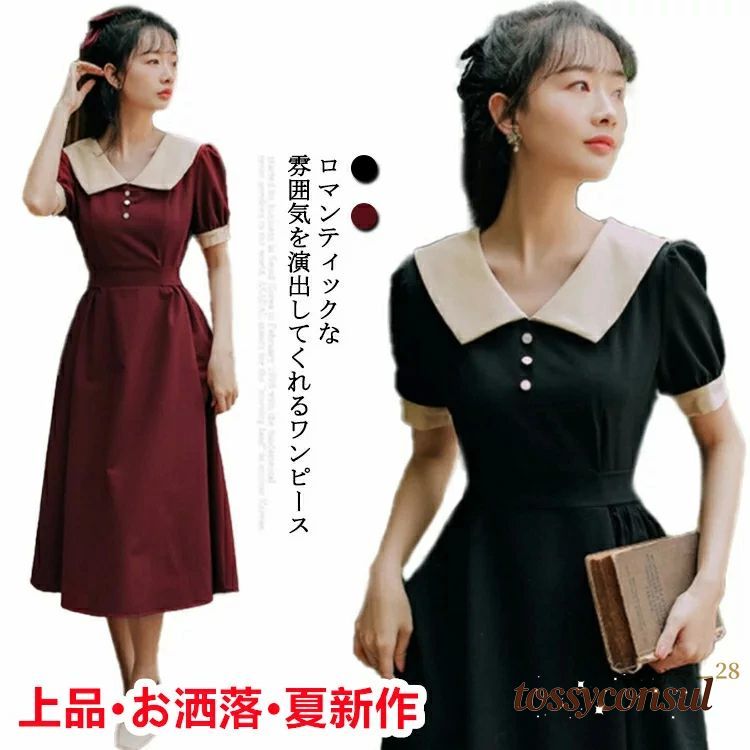 襟付き レトロ ワンピース 春 夏 レ レディースファッション 超目玉商品 ワイン ブラック S M L XL 2XL