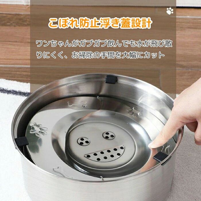 水面に浮かぶ浮き蓋が、一度に出てくる水の量をコントロール。ワンちゃんがガブガブ飲んでも水が飛び散りにくく、お口周りや耳が濡れるのを防ぎます。床が水で濡れるのを防ぐこぼれ防止・溢れ防止設計で、お掃除の手間を大幅にカット。ホコリや抜け毛が水に入るのも防いでくれるので、常に綺麗な状態を保ちます。
