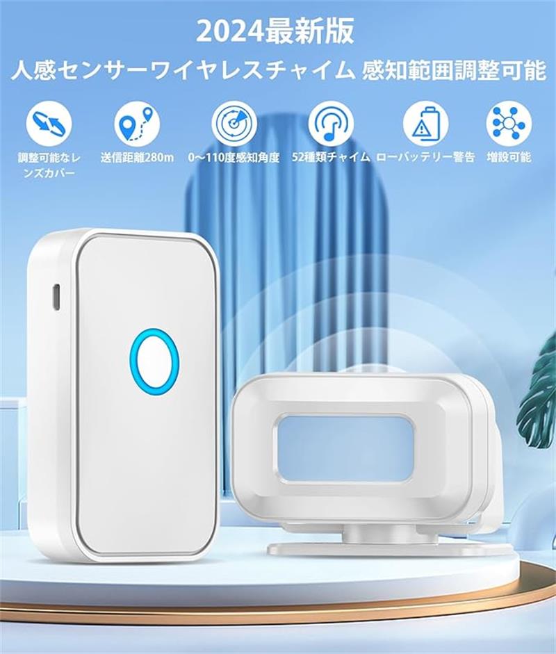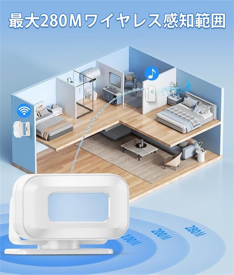 【配線工事不要のワイヤレスチャイムセット】人感センサー送信機:来客などを正確に感知できる動体検知機能、感知距離は2-7mで、感知角度は上下60°で、レンズカバーがあるので、左右0°~110°(可変)です。一定範囲内の人の動きを感知することができます。 回転すればセンサーの感知方向が360度自由に調整できます。人感センサーチャイムセット:離れた場所でチャイム音でお知らせ。受信機電波受信距離は屋外遮蔽物の無い状態で280m屋内で、見通しの良い場所で最大70m。呼び鈴、家庭内、老人、子供、ペット、会社、事務所、店舗などの呼び出しに便利であることなどでおすすめます。