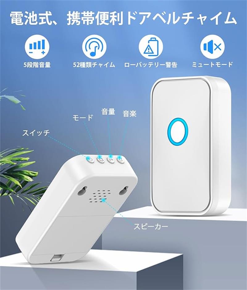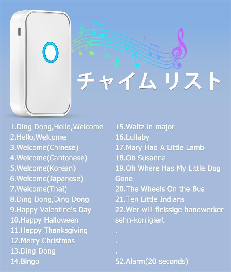 【5段階音量52曲音楽調整可能】ドアベルは合計52種類の着信音や各国の歓迎の言語を選べます。着信音リストに従ってお好みに合う着信音を選択することができます。5段階の音量は、ニーズに応じて音量を調整でき、大きすぎておびえることはありませんし、小さすぎて聞こえないことはありません。