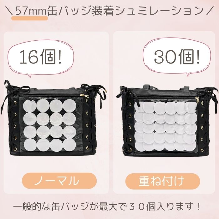 推しをデコって、全力アピール!「57MM缶バッジ装着シュミレーション:ノーマル16個;重ね付:30個 76MM缶バッジ装着シュミレーション:ノーマル99個;重ね付:16個」