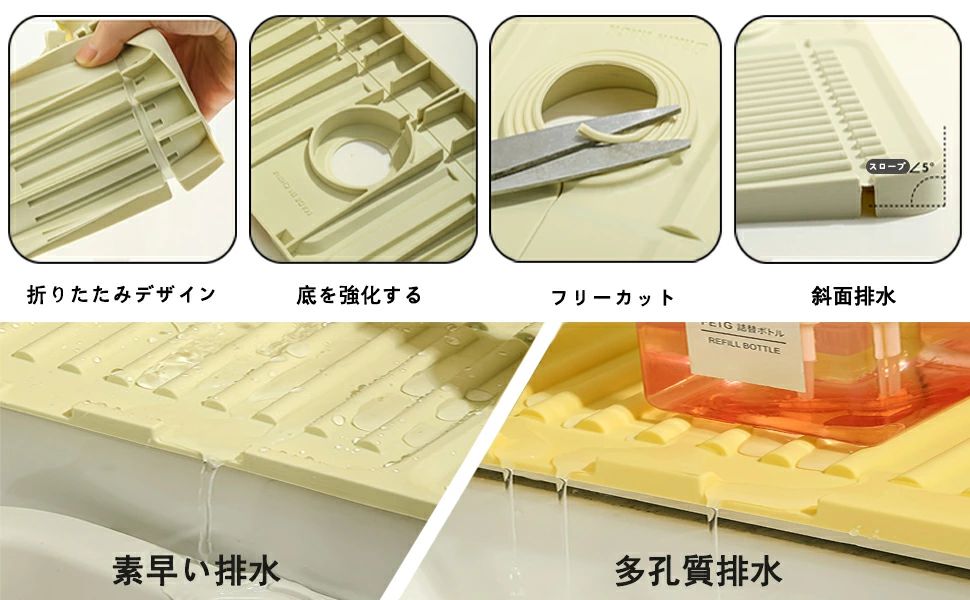 これらのマットは、特別な排水口を備えたシリコンマットの上に置かれ、水しぶきやカビに強い。水は直接シンクに流れ、清潔で衛生的です。