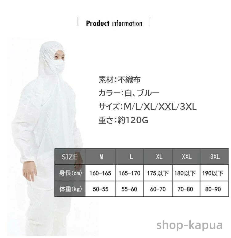 防護服 保護服 使い捨て 不織布 作業 メンズファッション 特集 M L XL XXL 3XL 白(PP-通常防塵):3630円税込 ブルー(PP-通常防塵):3630円税込 白(SMS-厚め防水):7150円税込 ブルー(SMS-厚め防水):7150円税込