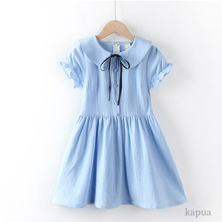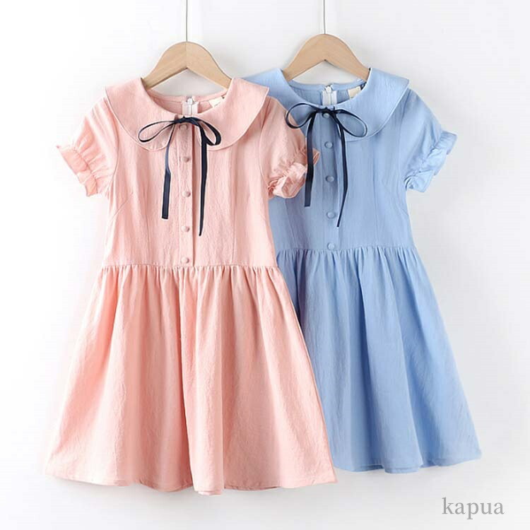 無地 リボン付き フレアワンピース 半袖 ミディアムワンピース 襟付きワンピース 女の子 子供服 ワンピース レディース