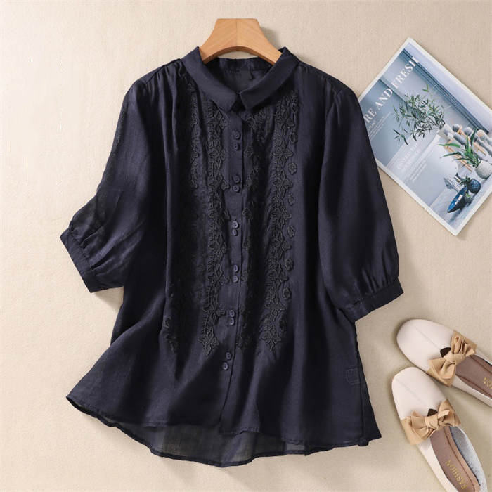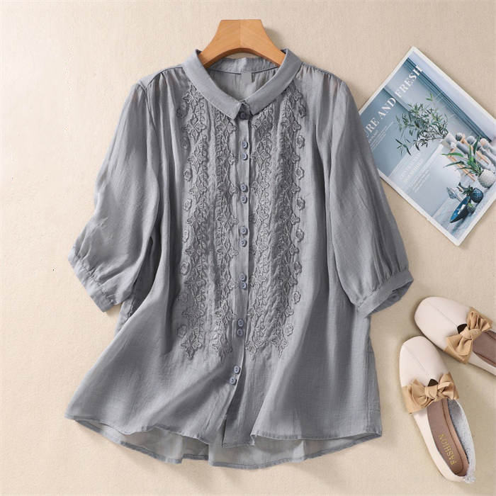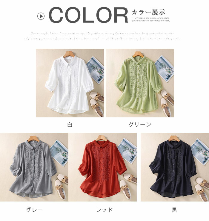 丸襟 シャツ 7分袖 レディース 刺繍 トップス シャツ ブラウス 新登場! 白 グリーン グレー レッド 黒 M L XL 2XL
