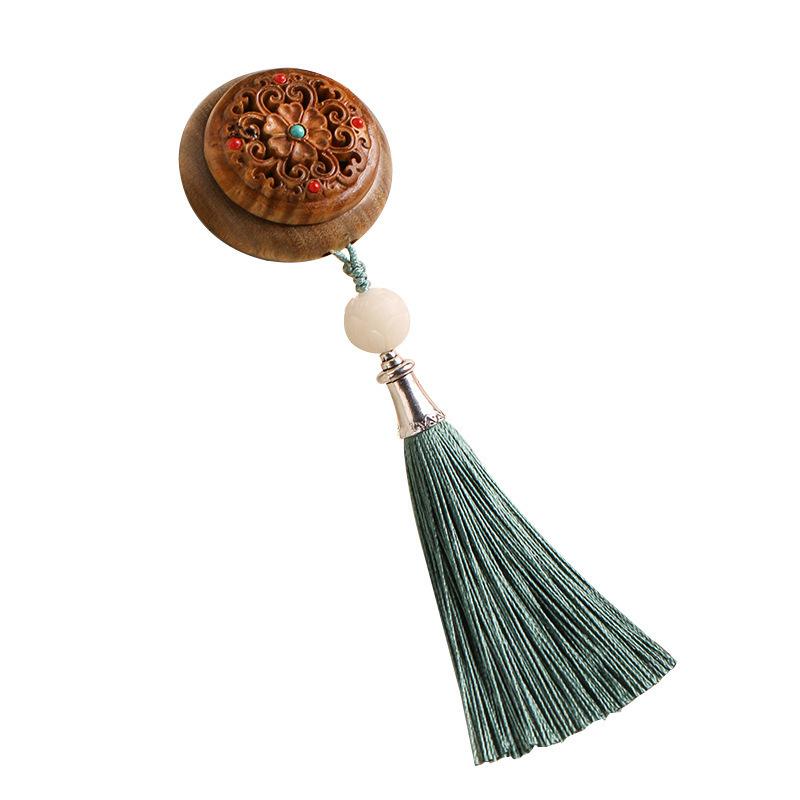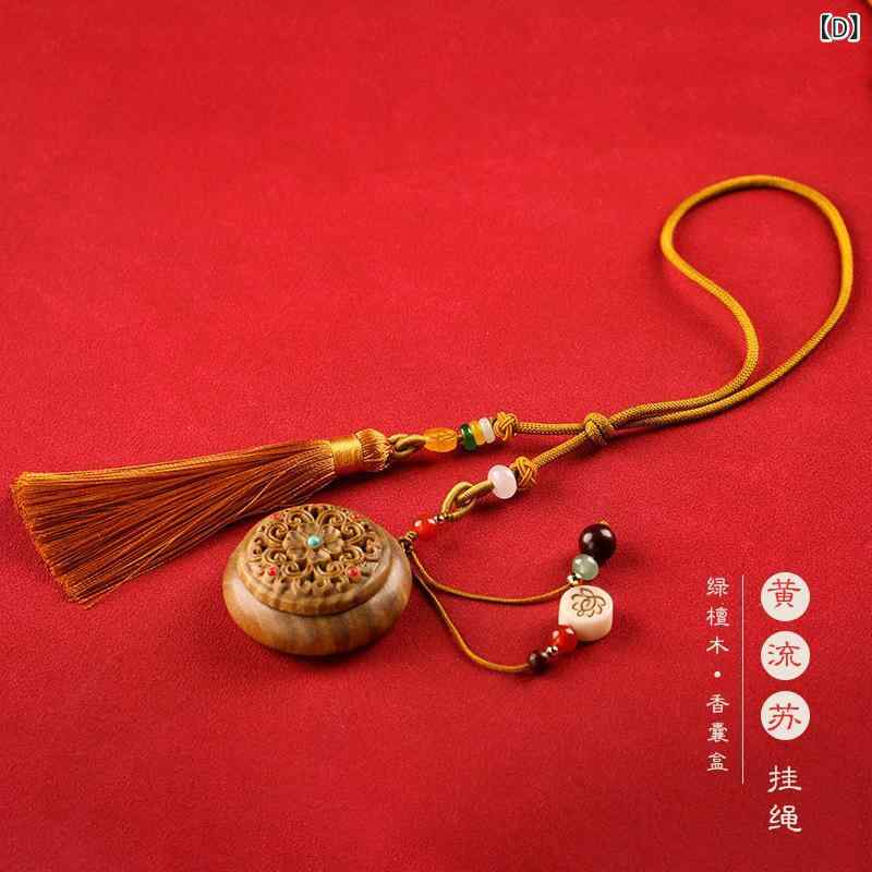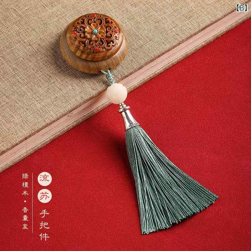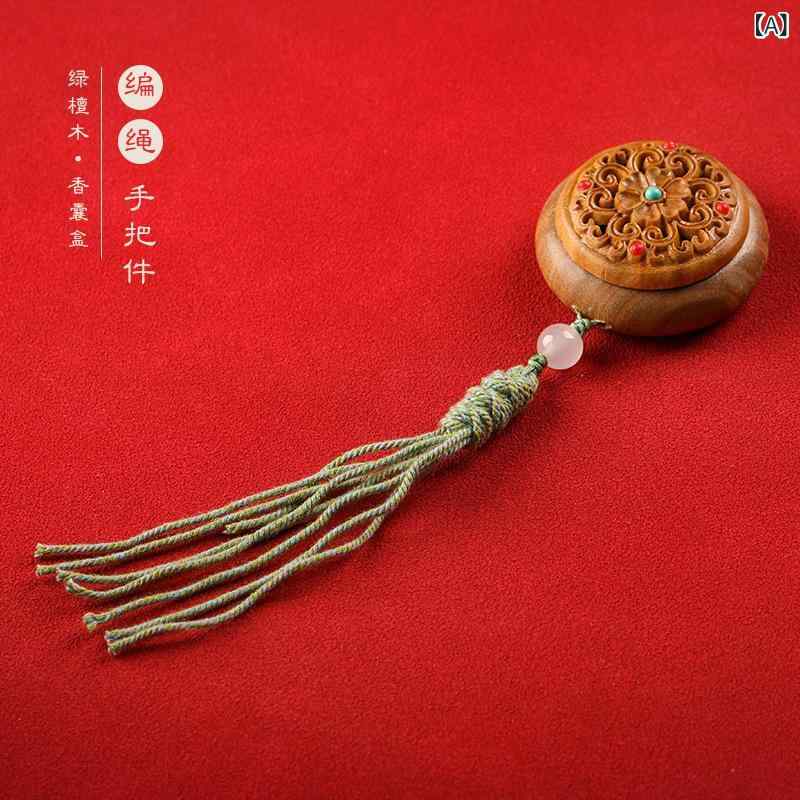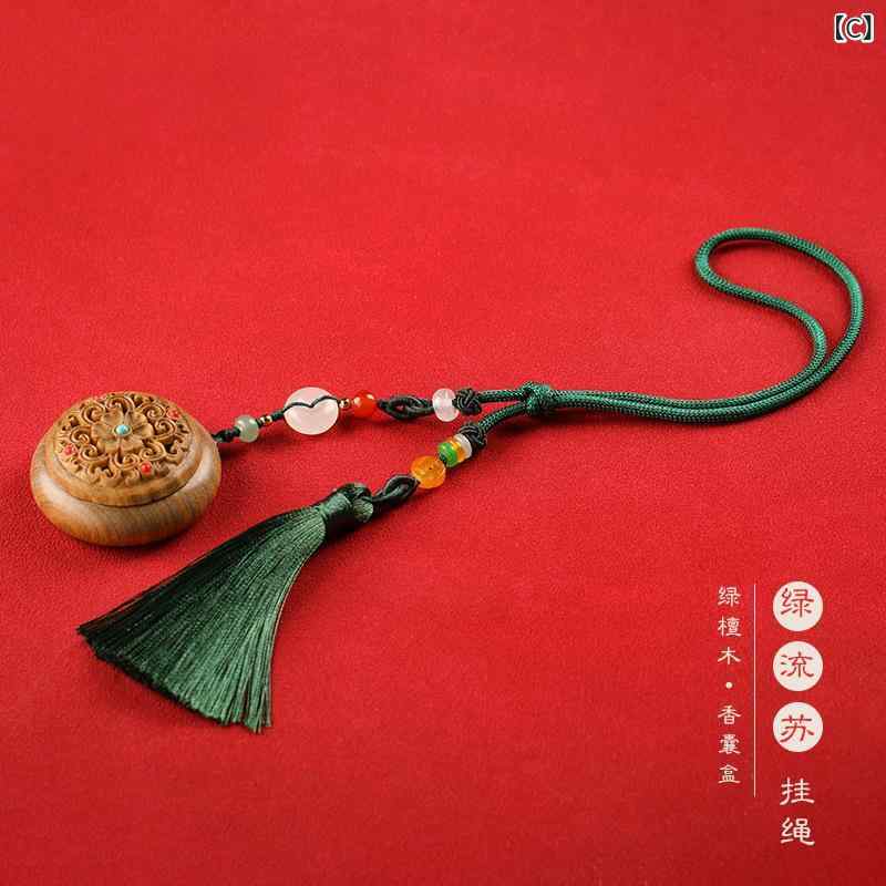 お香入れ 男女兼用 緑檀木 透かし彫り A:編み込み手持ち品 B:タッセル手持ち品 C:緑タッセル飾り D:黄タッセル飾り
