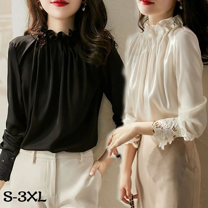 長袖 ブラウス レディース フリルネック フリル襟 シャツ トップス ハイネック レース袖 フォーマル 光沢感 ギャザー オ 華やか