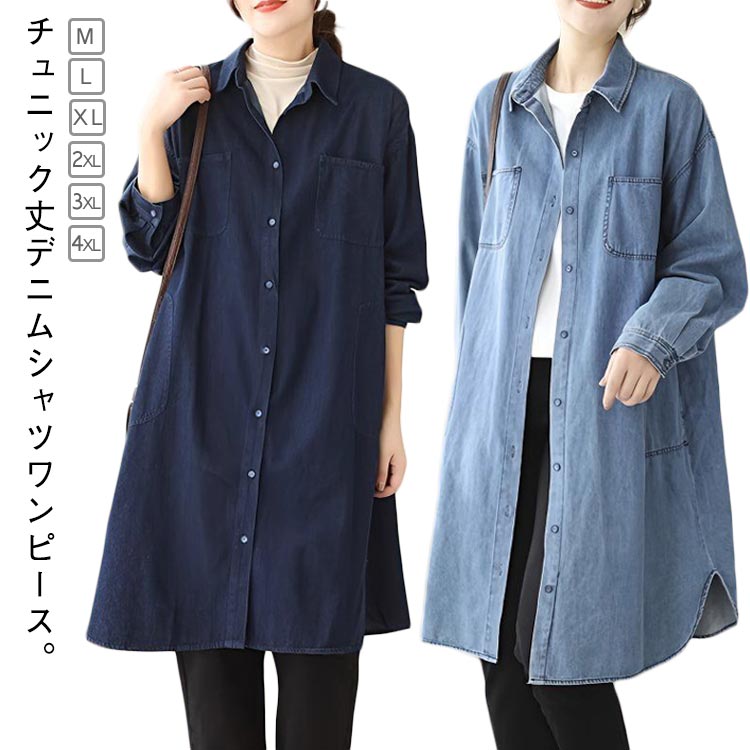 ゆったり チュニック丈 襟付き 体型カバー 長袖 秋 30代 デニム ワンピース チュニックワンピース デニムワンピース レディース デニムシャツワンピース 冬 きれいめ 40代 春