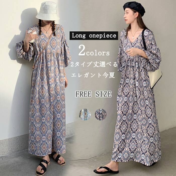 ロングワンピース 夏 半袖 レディース きれいめ ロング ロングワンピ エスニック パフスリーブ vネック フレアワンピース カジュアル ゆったり 体型カバー 大きいサイズ 花柄 無地 ビッ 着やせ