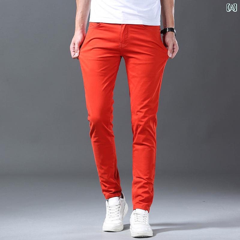 デニムパンツ スキニー スタイリッシュ 夏 薄手 オレンジ ジーンズ メンズ スリムフィット 裾細 ハイエンド カジュアル ロング パンツ ストレッチ
