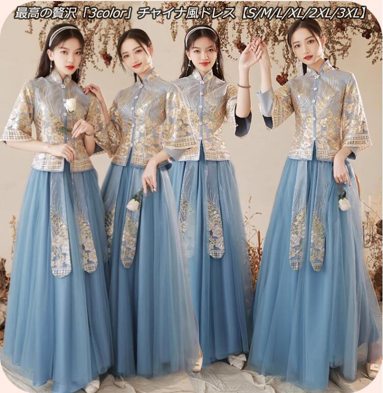 3色 2点セット 青 グレー シャンペン色 ブライズメイドドレス お揃い ドレス チャイナ風ドレス パーティードレス ロング ワンピース 演出 イベント ブライダル 結婚式 発表会 演奏会 レディース