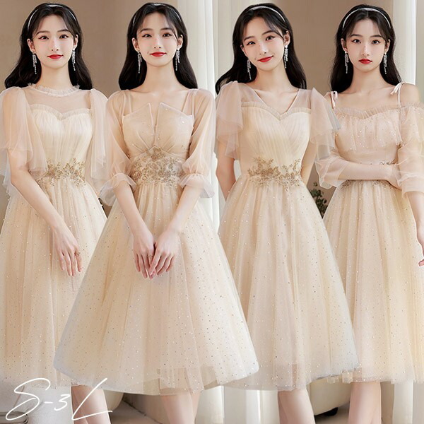 ブライズメイド ドレス ミモレ丈 シャンパン 結婚式 体型カバー