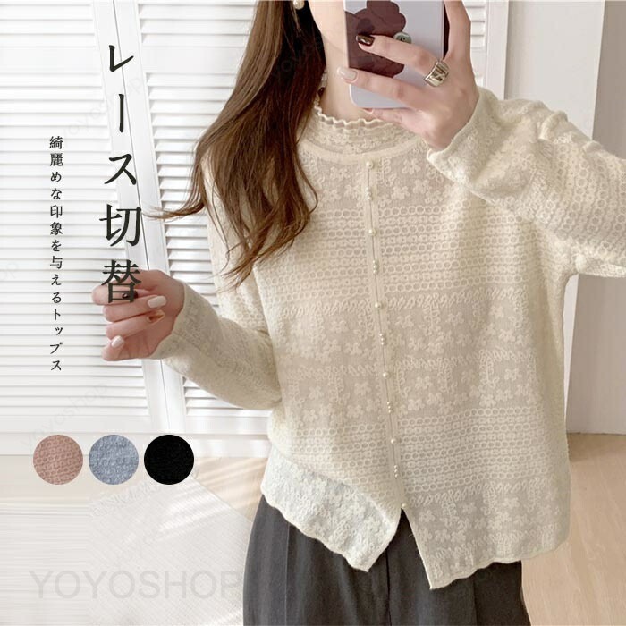 カットソー レース レディース 長袖インナー プルオーバー レース切替 パール ジャカ一ド 刺繍 フリルネック 春秋 Tシャツ 花柄 トップス 二ットソー 長袖Tシャツ tシャツ 無地 ス カジュアル