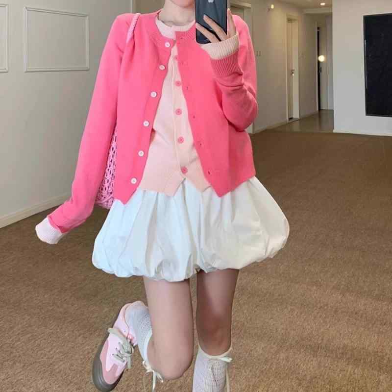 レディース 春 ニット カーディガン フェイクツーピース ラウンドネック 単色 爽やか かわいい 伸縮性 軽量 普段使い 通勤用 トップス 柔らかい