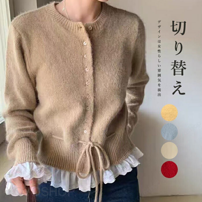 裾レース切替カーディガン カーディガン レディース 秋冬 ゆったり おしゃれ ニットカーディガン 秋 冬 きれいめ カーデ ショート 丸首 可愛い 大人 ファション