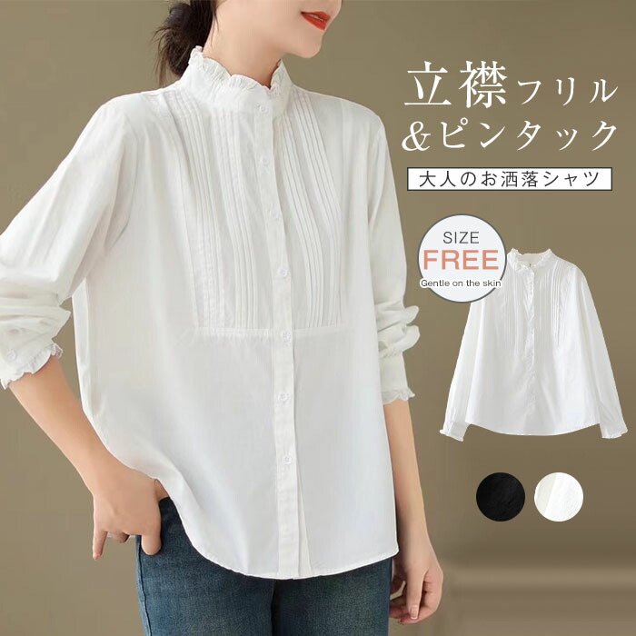フリル襟 シャツ ブラウス 長袖 立ち襟 ピンタック シャツブラウス レディース トップス 羽織り 春 秋 フォーマル 大人 可愛い ファッション おしゃれ きれいめ ゆったり