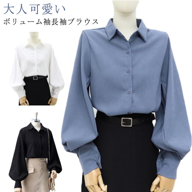 大人可愛い ブラウス バルーンスリーブ 長袖シャツ ボリューム袖 春秋 レギュラーカラー 無地 ゆとり レディース 上品 きれいめ オフィス 大人 女性 長袖 新作 パフスリーブ 通勤 トップス