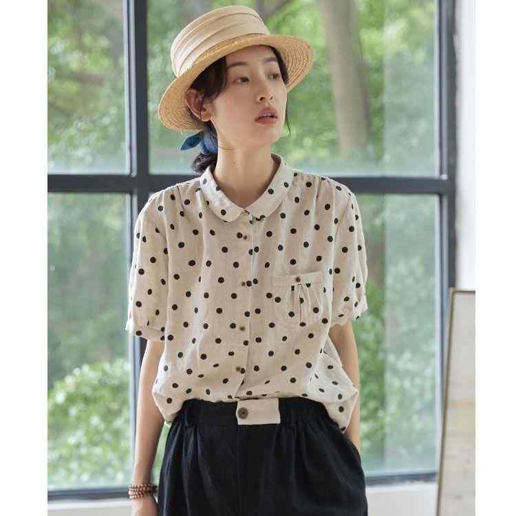 シャツ レディース 半袖 亜麻 リネン混 トップス 水玉 ドット柄 プリント ポロネック かわいい 快適 普段使い 日韓スタイル