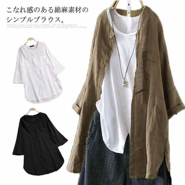 シャツ レディース トップス ブラウス チュニック 羽織り ロング丈 大きいサイズ ボタンシャツ 綿麻 麻混 羽織 シャツブラウス サイドスリット テールカット 体型カバー リラックス 母の ゆったり