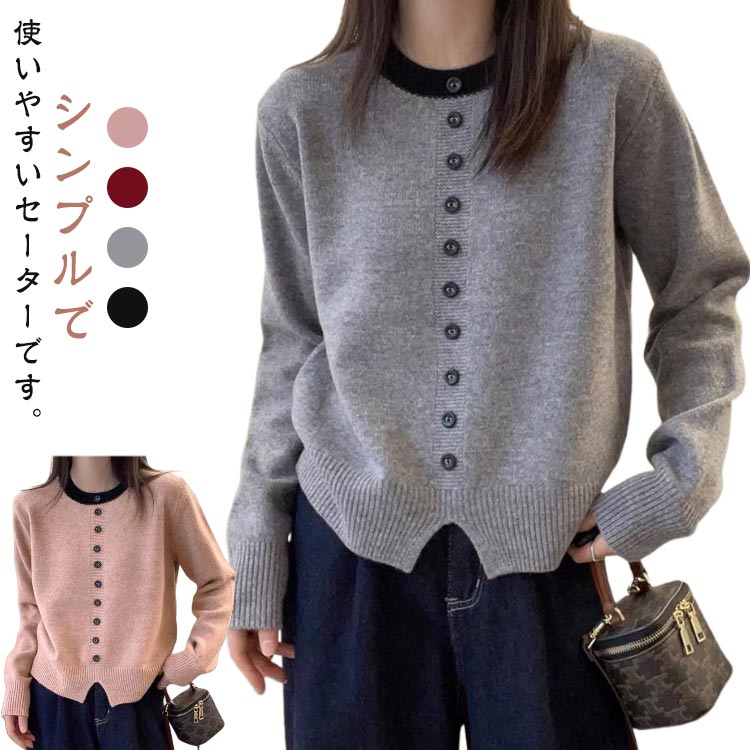 プル おしゃれ 長袖 ニット トップス 襟付き セーター レディース ボタン 秋冬 大人可愛い 無地