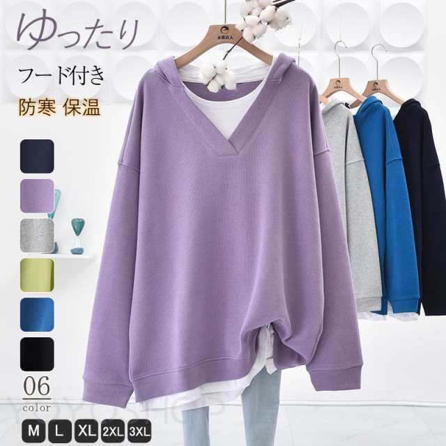 パーカー レディース フェイクレイヤード Vネック プルオーバー スウェット トップス ゆったり 長袖 秋冬 大きいサイズ 無地
