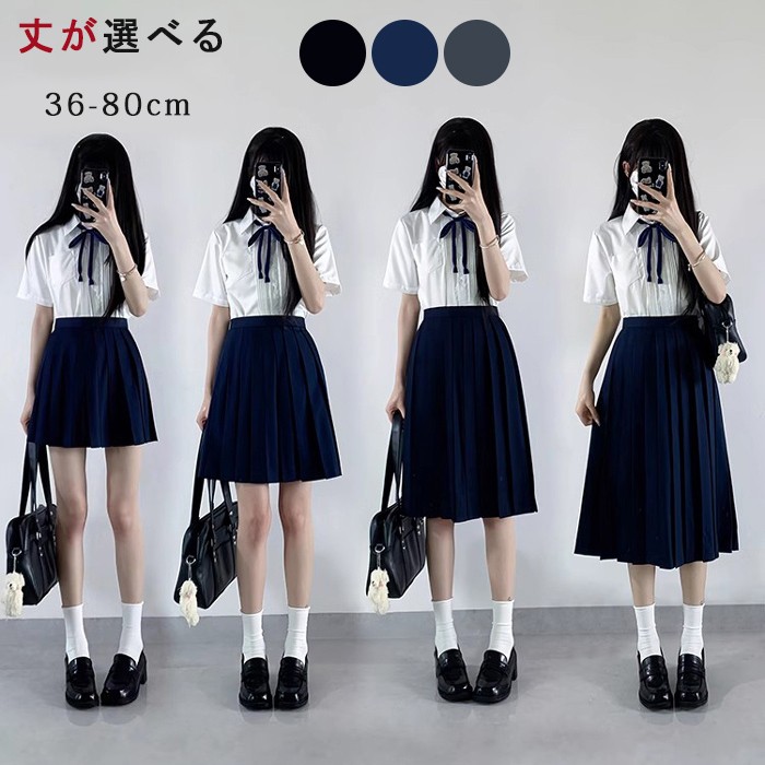 スクールプリーツスカート 車ヒダ 濃紺 黒 グレー 39-80cm丈 スクールスカート プリーツスカート ロングスカート 正統派 制服 女子高生 通学 学生服 中学 無地 膝下 長め シンプル ひざ丈