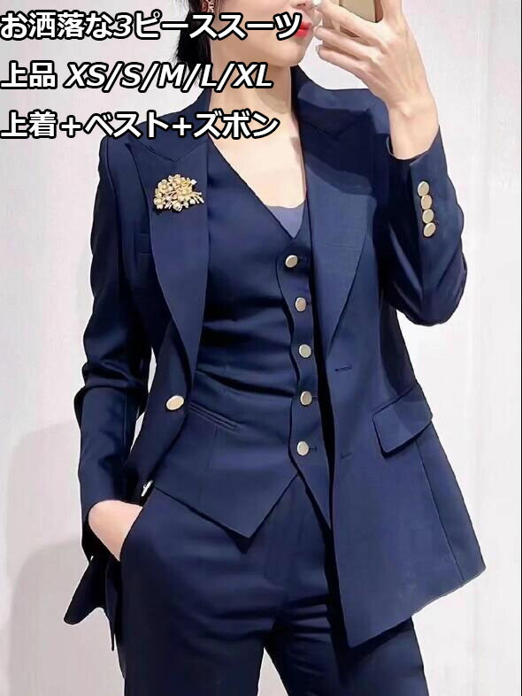 超人気 無地 ネイビー セットアップ 3点セット レディース ジャケット+ベスト+9分丈パンツ レディーススーツ 3ピーススーツ S~ 1つボタン スリムスーツ スタイリッシュスーツ