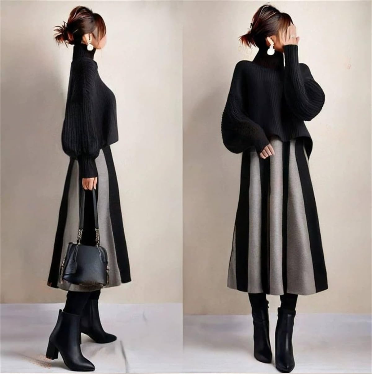レディース 2点セット セットアップ ハイネックセーター&ストライプスカート 冬服 冬トップス スカートスーツ ランタンスリーブ ハイウエスト フレア型 ドンキング ゆったり お洒落 エレ カジュアル