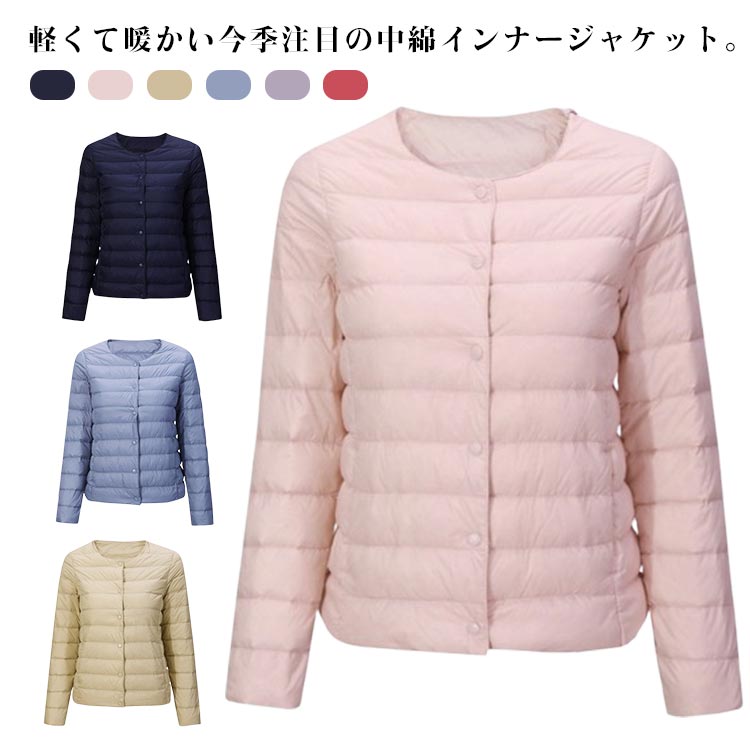 クルーネック インナーダウンジャケット ショート レディース ジャケット ライトダウン 中綿 インナー コートイン ノーカラー 軽量 薄手 防寒 長袖 あたっか インナージャケット 保温