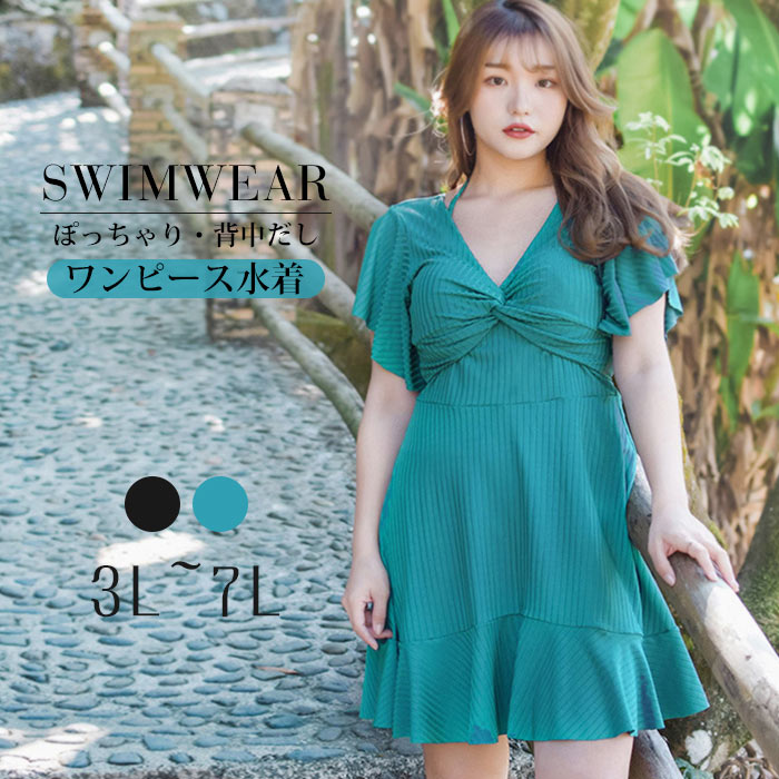 ワンピース水着 大きいサイズ 水着 ぽっちゃり レディース ぽっちゃり水着 袖あり 体型カバー 韓国 可愛い かわいい Vネック 背中だし 着痩せ ワイヤー入り パッド付 ビーチ 海デート 温泉 7L