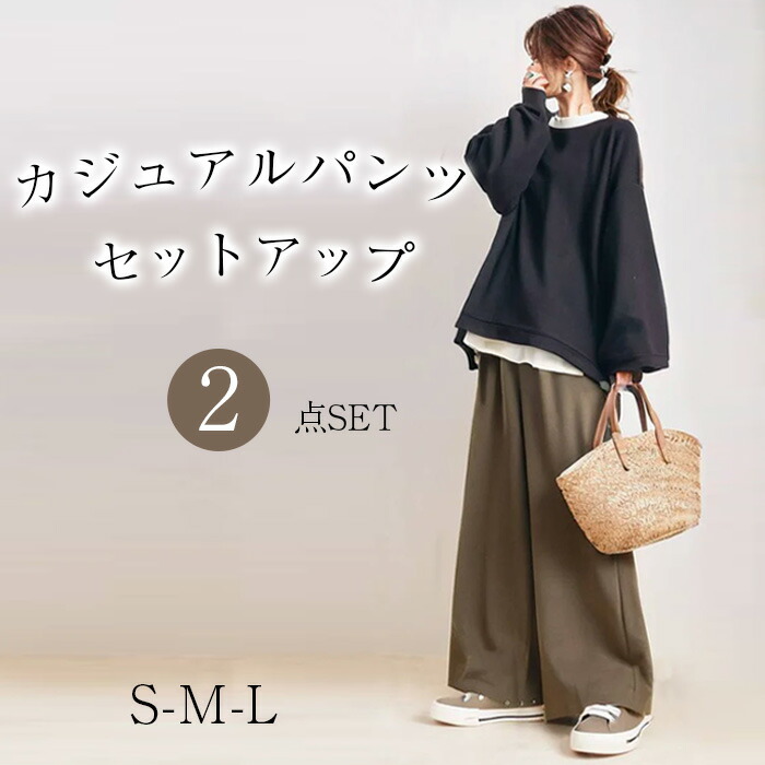 シンプルトップス&ロングパンツのセットアップが登場です♪ スウェット 体型カバー カジュアルパンツ セットアップ レディース 長袖