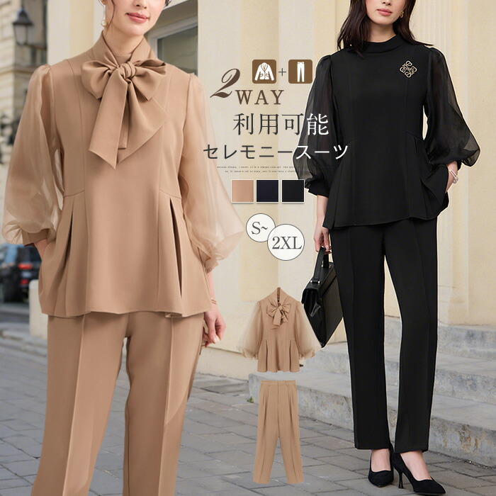 セットアップ レディース セレモニースーツ 入学式 ママスーツ 卒業式 スーツ 母 卒園式 ママ オシャレ ボウタイブラウス 異素材 切替 入園式 服装 結婚式 パンツドレス パーティードレス 母親