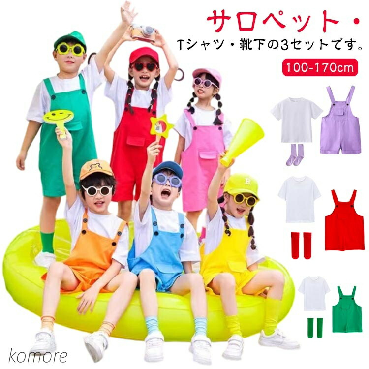 サロペットパンツ 3点セット 保育園 カラーパンツ 男の子 子供服 女の子 ダンス衣装 カラフル 半袖Tシャツ+オーバーオール+靴下 ベビー服
