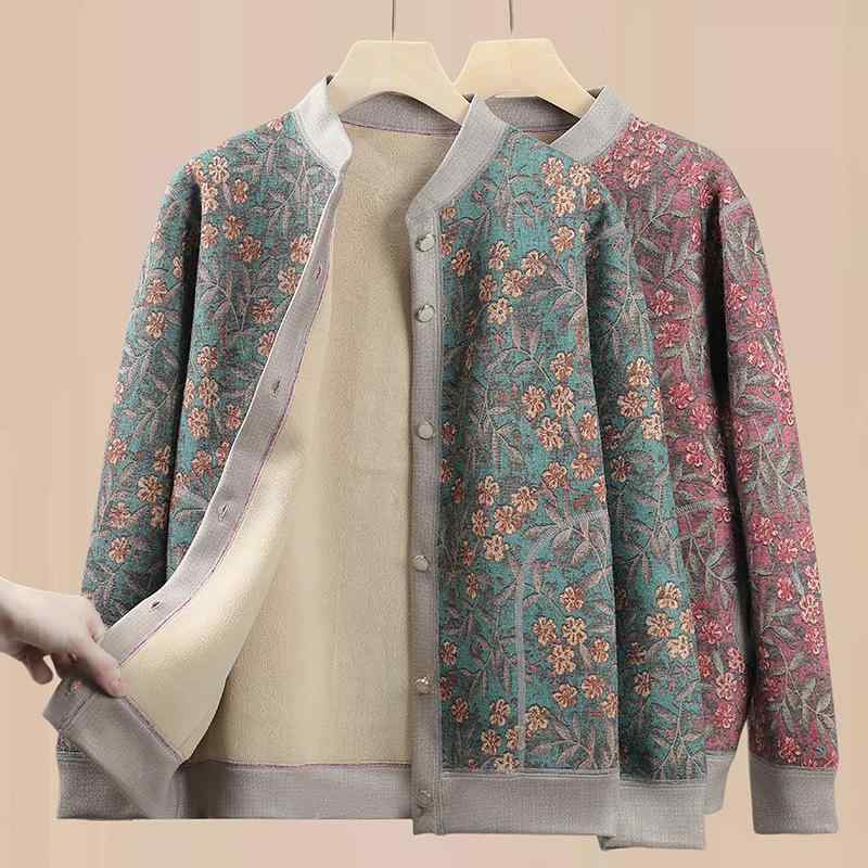 カーディガン 女性用 シニア マダム 婦人 高齢者向け 秋冬 裏起毛 厚手 保温 防寒 長袖 アウター 上着 羽織り グリーン レッド ポリエステル
