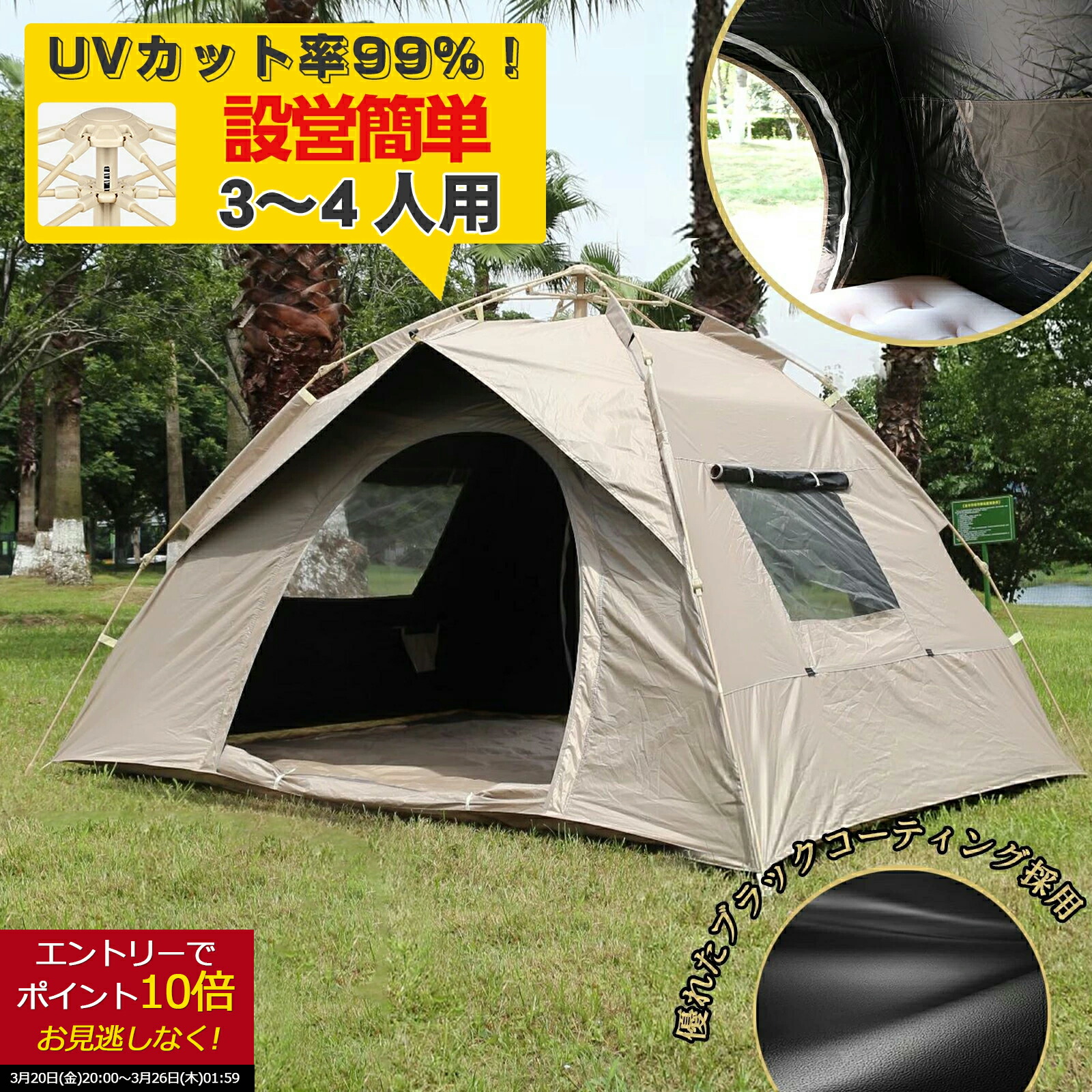 【10倍+15%クーポン】開催時間:3月20日20:00~3月26日01:59 カット99%以上! 当社自慢の「ブラックジェルカットテント」は、普通のテントと比べて驚異的な遮熱効果を実現!