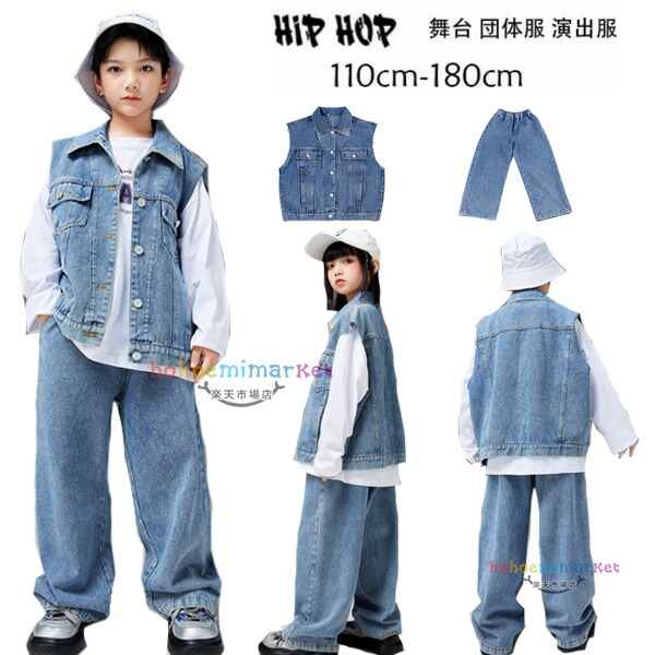 ダンス衣装 ヒップホップ キッズ ストリート ダンス服 男女兼用 デニムベスト デニムパンツ 女の子 男の子 かっこいい hiphop K-pop 舞台 演出服 子供ダンス ダ 団体服