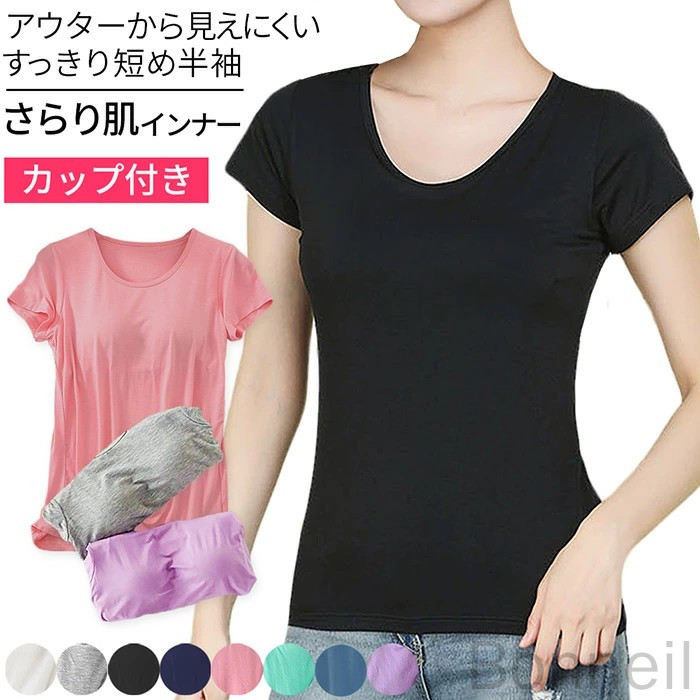 カップ付き インインナー 半袖Tシャツ ブラトップ フレンチスリーブ パッド付き 肌着 ベーシック ストレッチ素材 快適着心地 大きいサイズ 女性用インインナー 夏用インナー リラックス 小さいサイズ