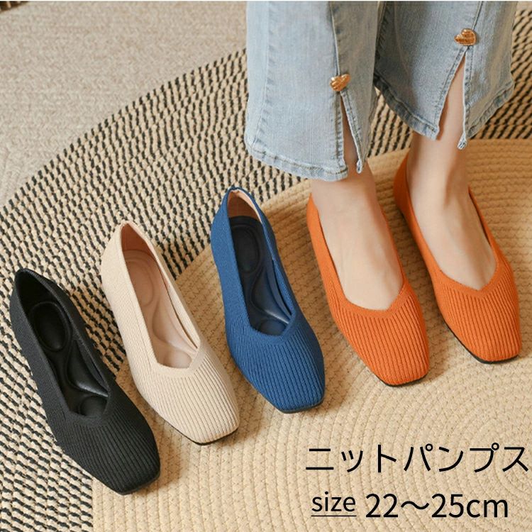 ニットパンプス 靴 パンプス 痛くない 春ブーツ 歩きやすい 走れる スクエアトゥ 4センチヒール フラット レディース シューズ ニット素材低反発 小さいサイズ 大きいサイ 柔らか