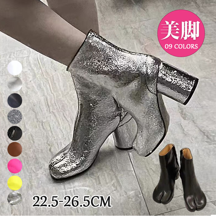 歩きやすい チャンキーヒール 太ヒール ブラック 黒 シルバー タビブーツ 22.5-25.0