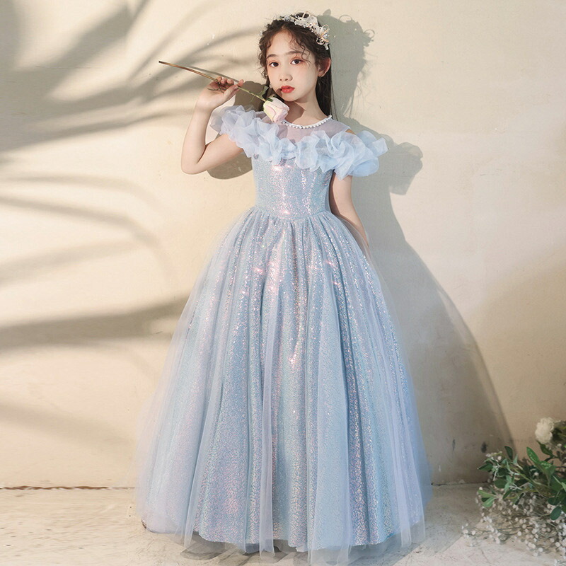 子供ドレス ブルー 水色 キラキラドレス ピアノ発表会ドレス ロングドレス ピンク オフショルダー パール 可愛い 演奏会ドレス 女の子 ロング スパンコール キレイめ 女児ドレス 七五三ド キラキラ