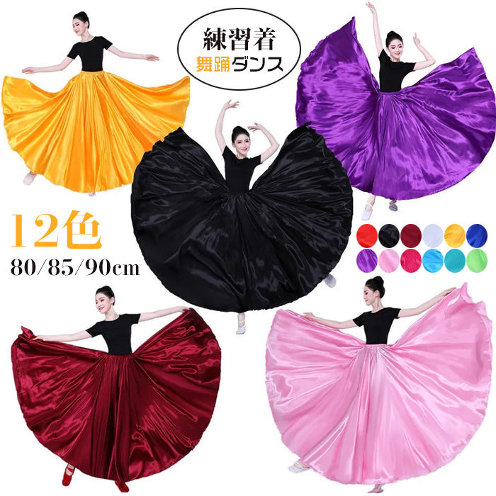 ダンス スカート サテン 大きい裾 広がる ロング丈 80cm 85cm 90cm ベリーダンス 練習着 レッスン着 カラフル 12色 光沢感有り 古典舞踊ダンス モダンダンス 民族ダ 無地
