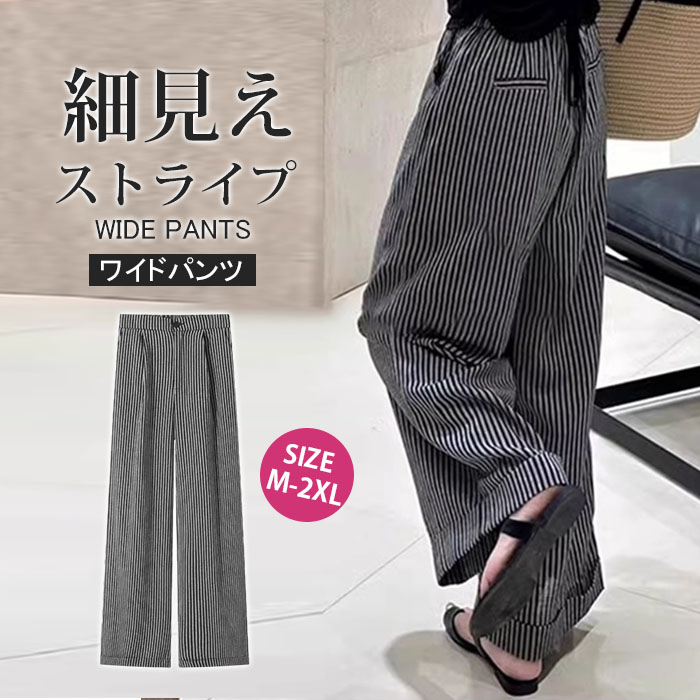 ワイドパンツ レディース ガウチョパンツ ストライプパンツ ストライプ ワイド タックパンツ ゆったり カジュアル きれいめ 大きいサイズ ボトムス ズボン 体型カバー ウエスト ロング