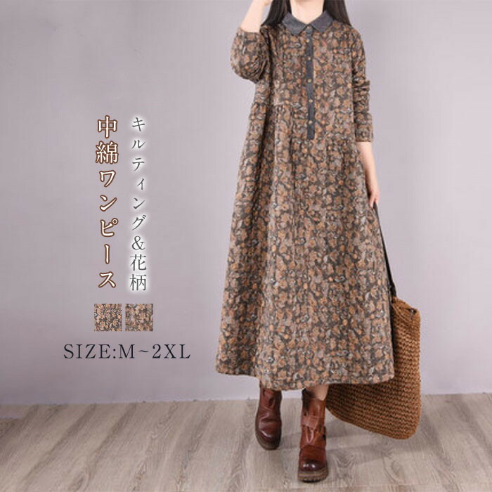 キルティング ワンピース 長袖 40代 秋冬 レディース ロングワンピース 中綿 30代 50代 aライン ロング 花柄ワンピース 大きいサイズ きれいめ カジュアル ナ 大人