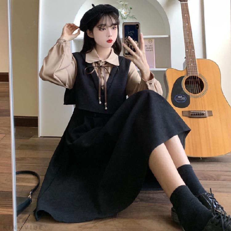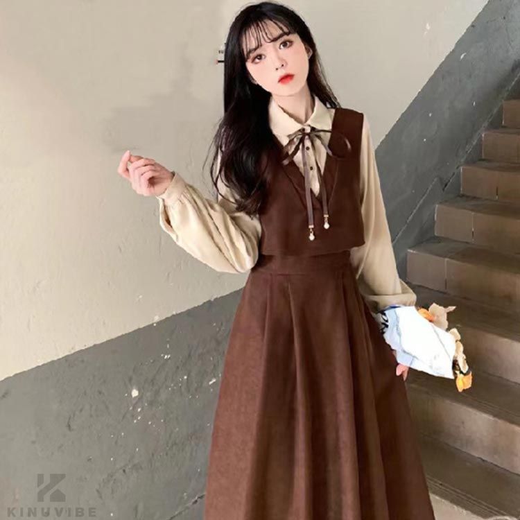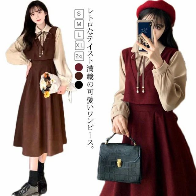 着痩せ ワンピース 長袖 春 膝下丈 レディースファッション 超目玉商品 ブラウン ワインレッド ブラック S M L XL 2XL