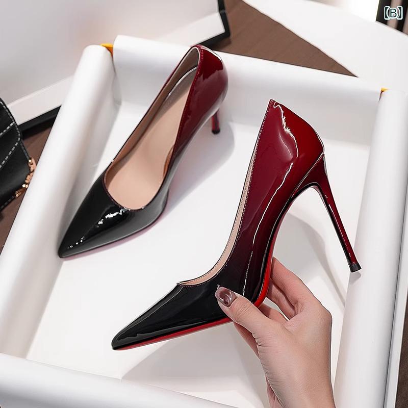 パンプス 婦人靴 ハイヒール 女性用 赤底 黒と赤のグラデーション パテントレザー エレガンスシューズ 魅惑的 スティレット 浅い口 万能 シューズ ヒール