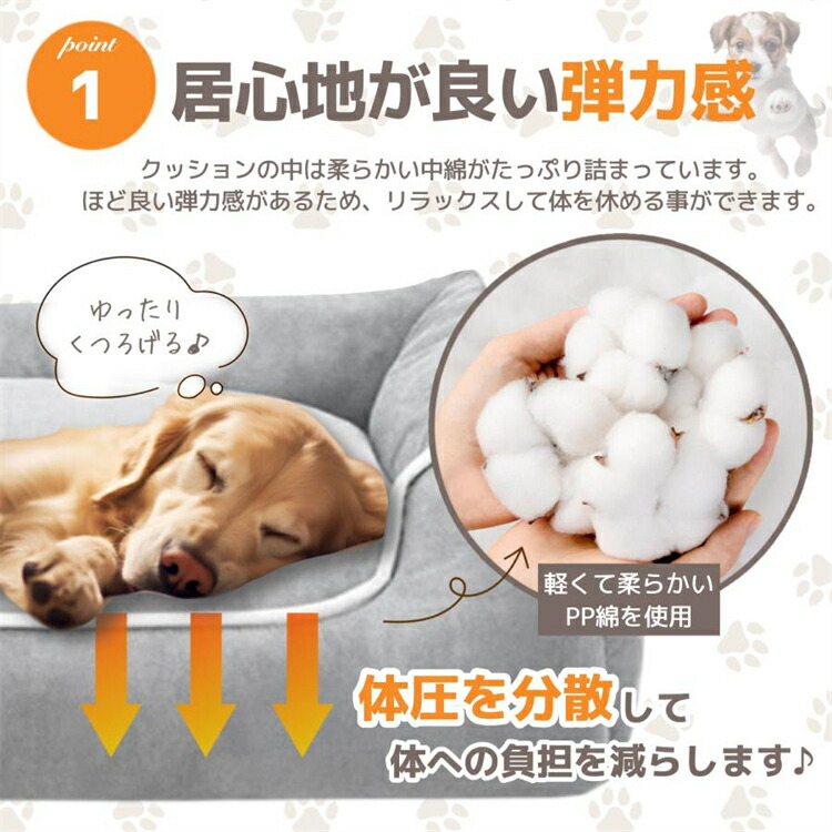 ベッドの枕部分は抗菌防臭加工済みの中綿を使用で衛生的。中綿をたっぷり入れてふわふわであご乗せやすい枕です。さらに3面に枕付きで仰向け・横向け・どんな寝姿勢でもぐっすり眠れます。