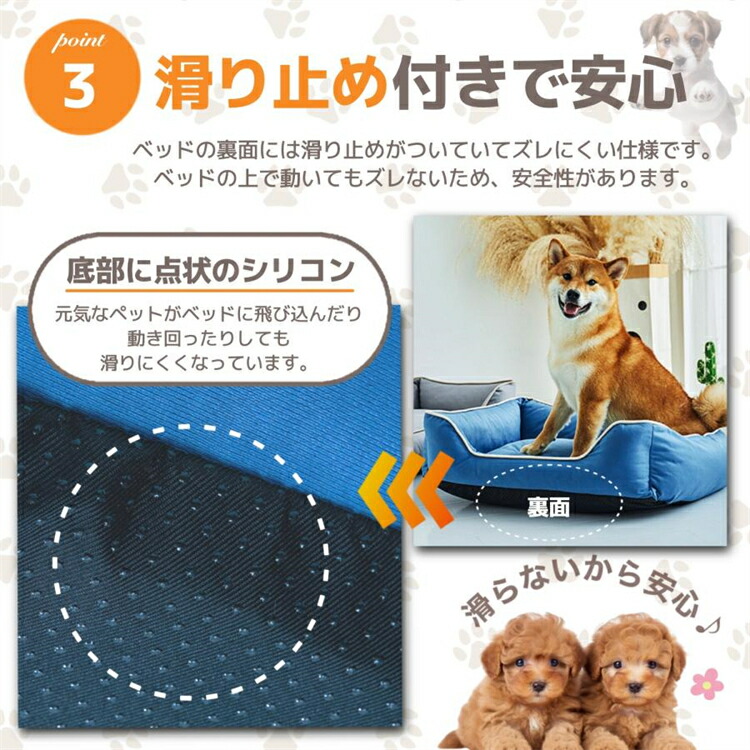 ベッドの裏面には点状のシリコンがついていて滑り止めになっています。元気なワンちゃんやネコちゃんが動いたり飛び込んでもずれにくいです。