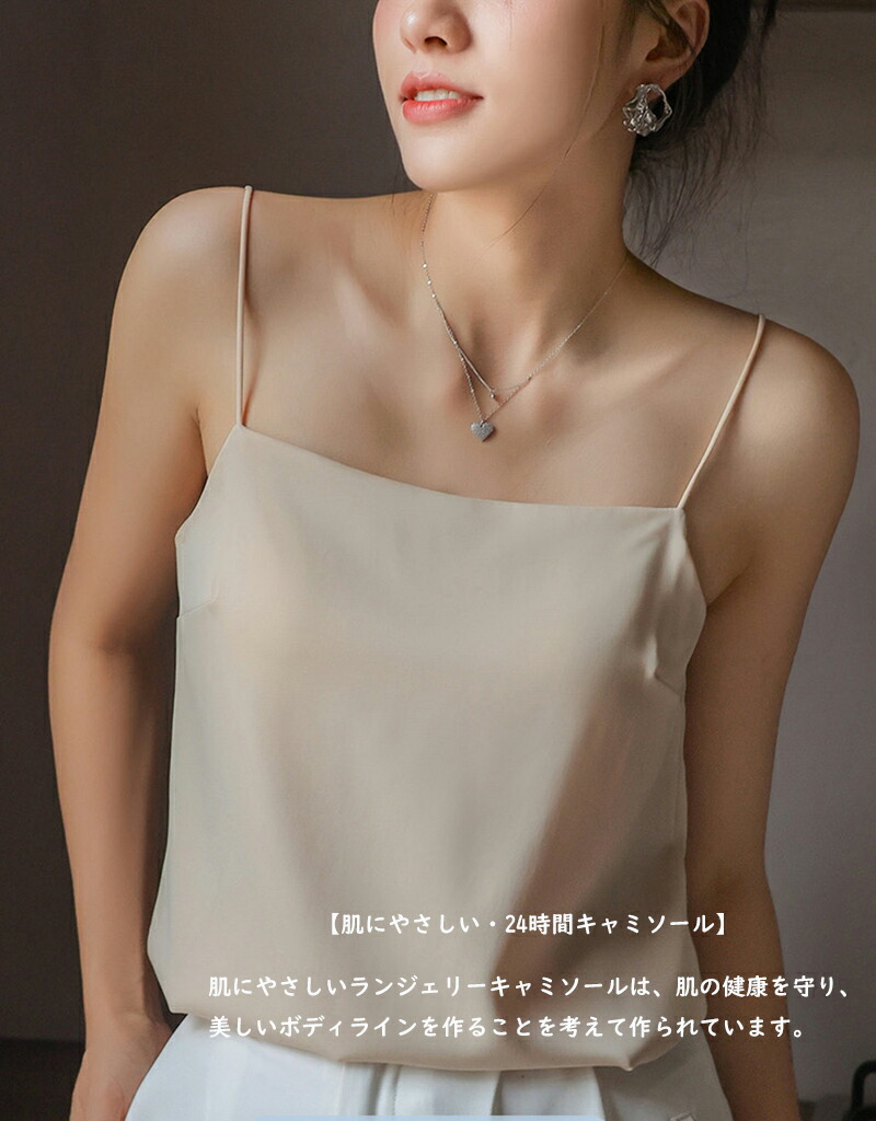 【肌にやさしい・24時間キャミソール】カップ付きキャミソール 肌にやさしいランジェリーキャミソールは、肌の健康を守り、美しいボディラインを作ることを考えて作られています。カップのない下着もありますが、ブラジャーを着用しなければならず、体が窮屈です。このカップ付きキャミソールなら、1枚でもOK!洗濯機で洗えて、チクチクしません! キャミソールの丈は、おへその上、見えても見えないちょうどいい長さで、カジュアルシックに着こなせます。このキャミソールは、室内で一枚で着ても、薄手のシャツを羽織ってもOK。