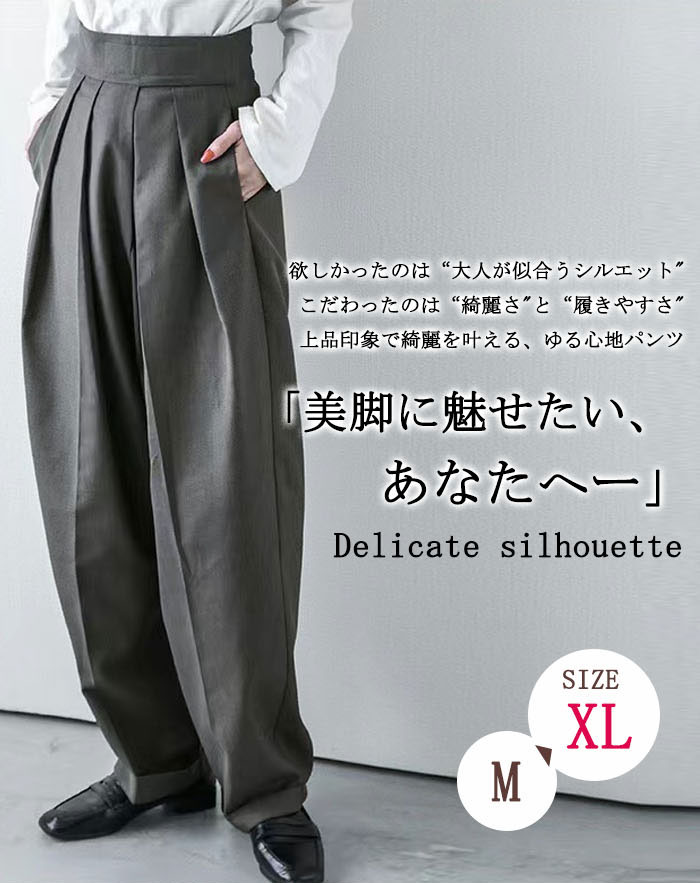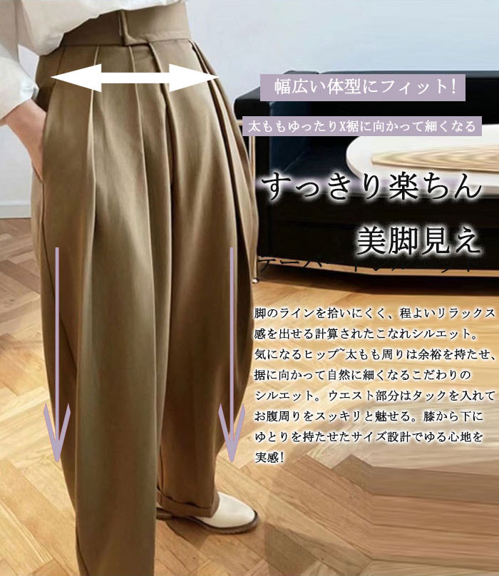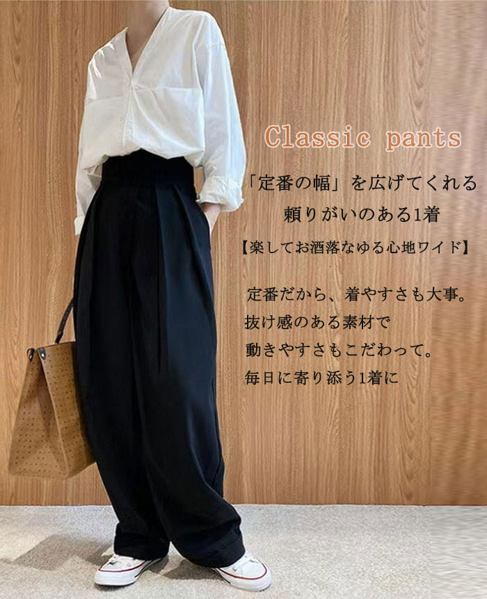 タックワイドパンツ レディース ボトムス 春 夏 イージーパンツ ワイドパンツ マジックテープ タック スラックス 美シルエット タックパンツ ハイウエスト ロング丈 通勤 オフィス カジュ きれいめ